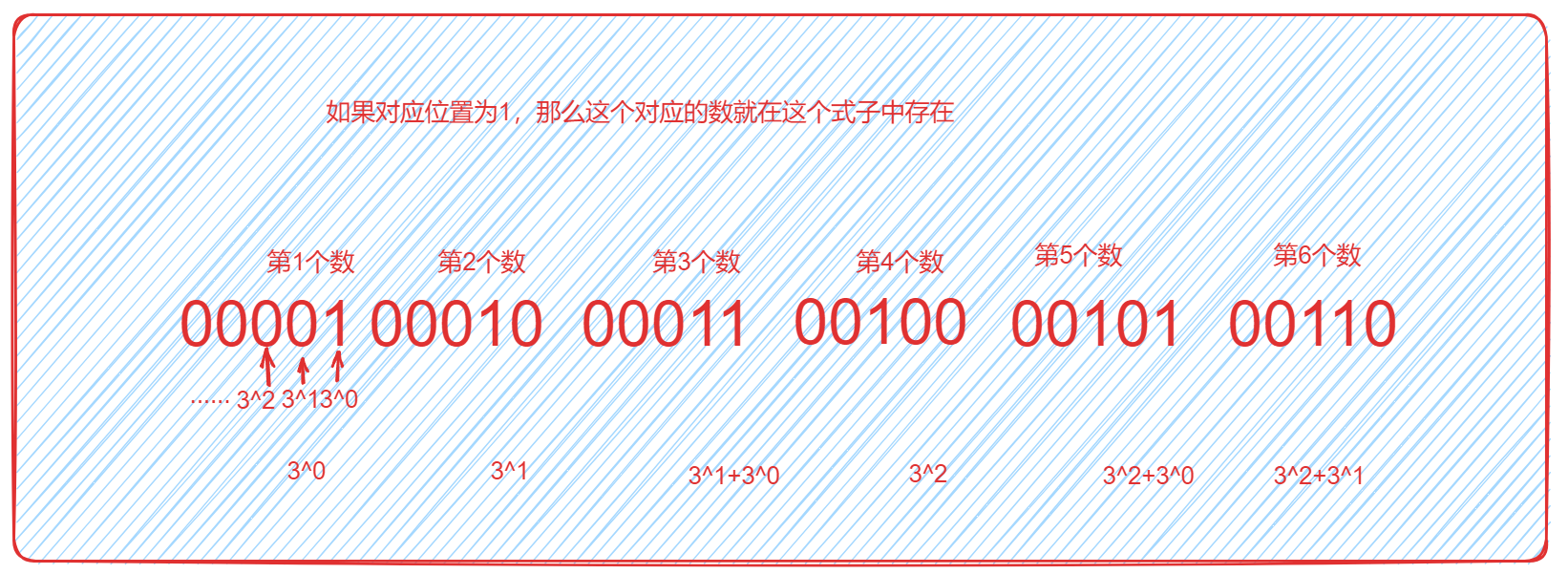 这道题目实质上就是一个扩展思维类型题目,大家可以仔细观察一下题目给出的一串数列,然后再结合二进制来看一下就不难看出就是一个从1~n的二进制数的排列罢了,比如说:对于数字9而言对应二进制位1001,那么我们对应数列的项就是3^0 + 3^3。