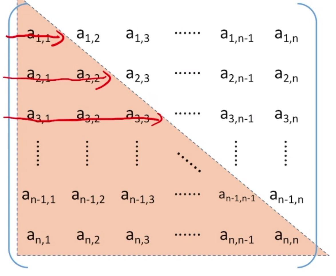 下三角矩阵按照行优先原则存储方式: