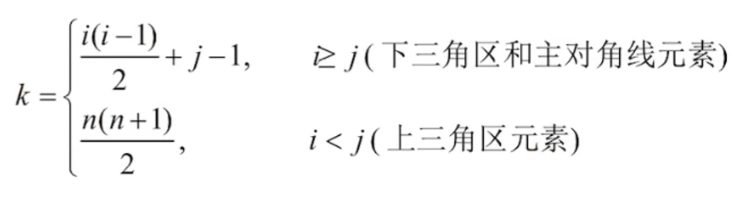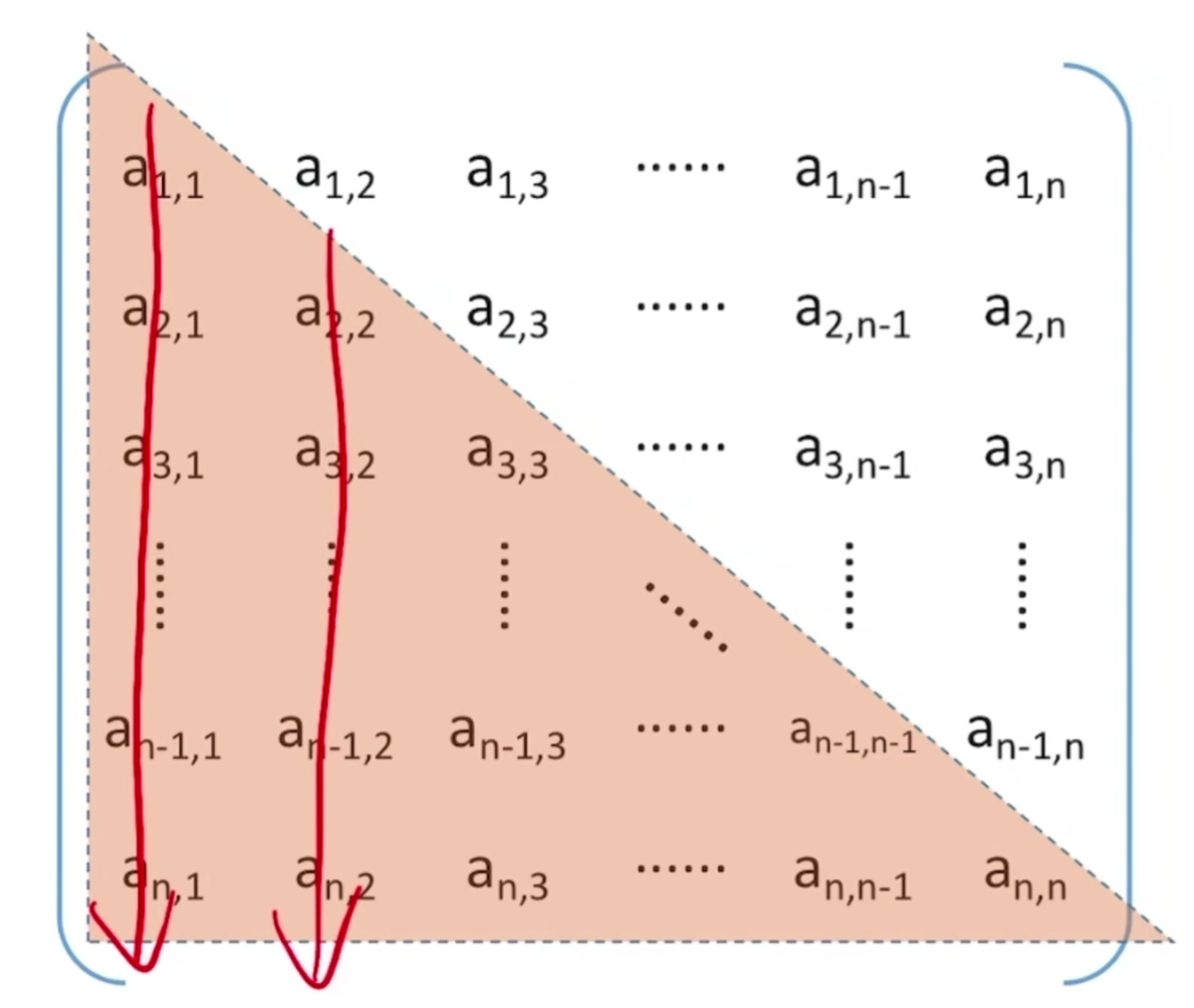 按照行优先原则: ai,j 是第i * (i - 1) / 2 + j 个元素,下标就是 i * (i - 1) / 2 + j - 1 这些东西是不可以直接死记硬背的,应该在考场中可以直接推导的,而且公式一般最后推出来也不是前面写的公式,题目肯定会稍微有些改动的。