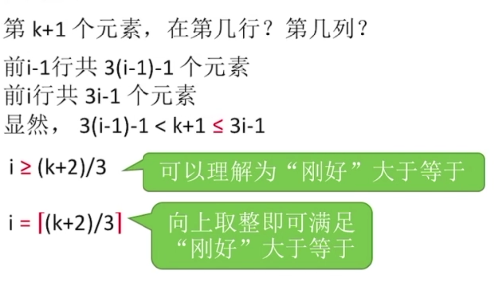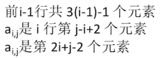 按照行优先原则: ai,j 是第**[n + n - 1 + … + (n - j + 2)] + (i - j) + 1** 个元素。但是像这种公式推理毫无意义,最好现推。