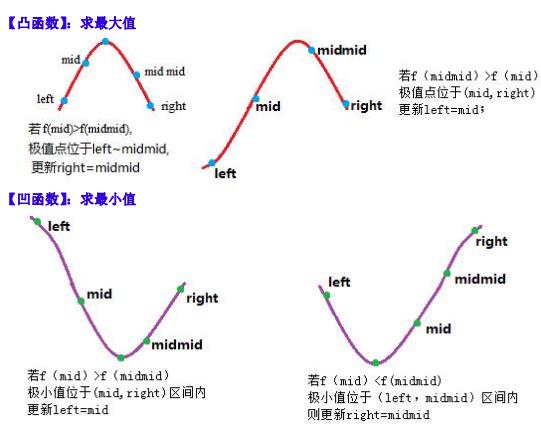 二分查找适用于单调函数中逼近求解某点的值。如果遇到凸性或凹形函数时,可以用三分查找求此凸点或凹点。